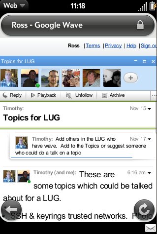 Positives: As far as collaborative communication is concerned, Google Wave really is impressive. We recently started a LUG (Linux Users Group) wave, and I think we’ve done more constructive communication on that wave in a couple days than we have done in the last six months on the mailing list. Widgets are fun. I wish there were more of them. Real time communication is a good feature. Waves can be read across platforms (Windows, Linux, Mac, Handhelds. etc.) Negatives: Lag can be an issue, especially during real-time communication. Sometimes, clicking to reply (or clicking several times while waiting for the window to open) will cause multiple reply threads to open, which can be annoying to delete. More widgets would be nice. I assume that that will increase over time. I interacted with Wave on a Palm Pre emulator, and although I was able to load Wave and read waves, my ability to interact with those waves was less successful, since wave employs a fair bit of right clicking, holding and dragging in its interface, and I haven’t quite figured out how to do those things in my Pre emulator.